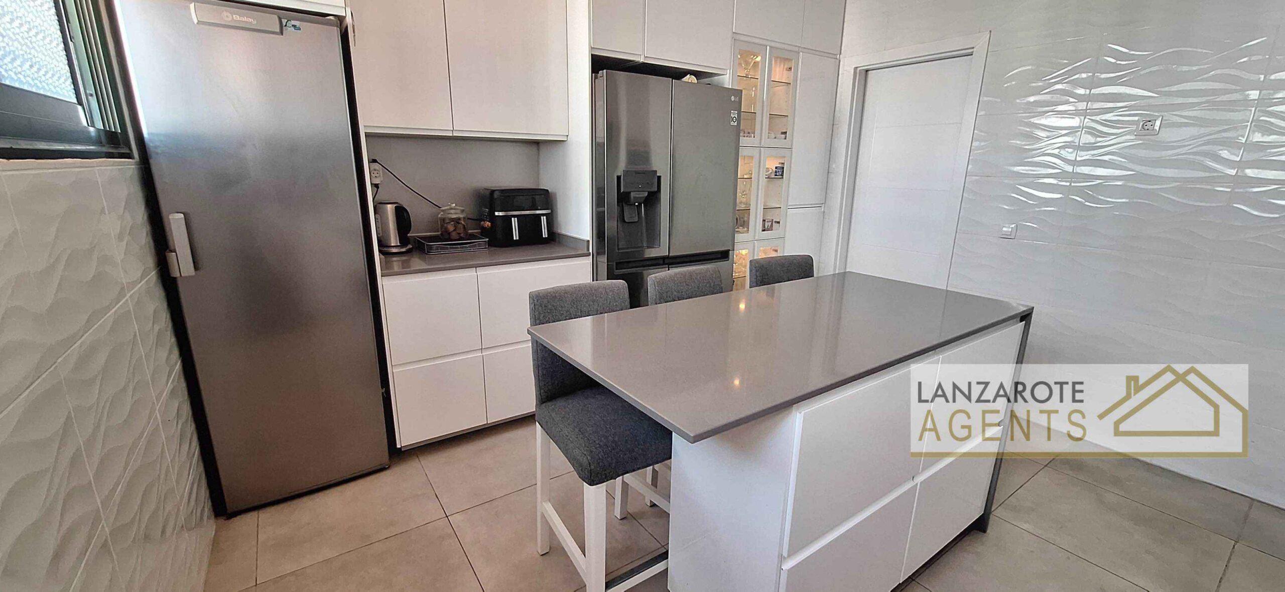 Spread over two floors, this beautifully maintained home offers generous living space and a thoughtful layout. On the ground floor, a bright and modern independent kitchen has been recently refurbished, seamlessly combining the original kitchen and laundry room into one large, stylish cooking area. The spacious lounge creates an inviting setting for family life and entertaining, with patio doors opening onto a private terrace, ideal for enjoying the warm Lanzarote climate.