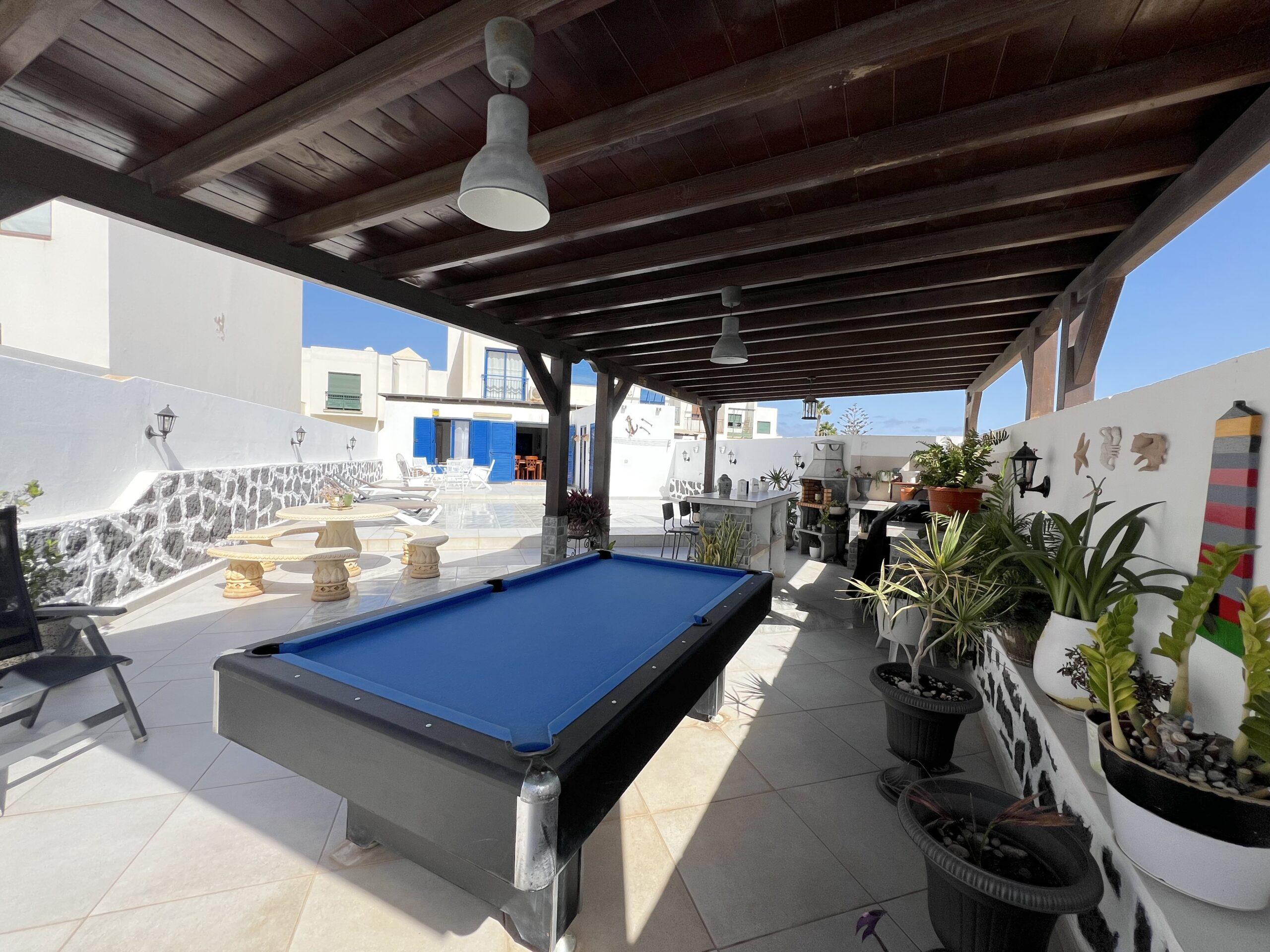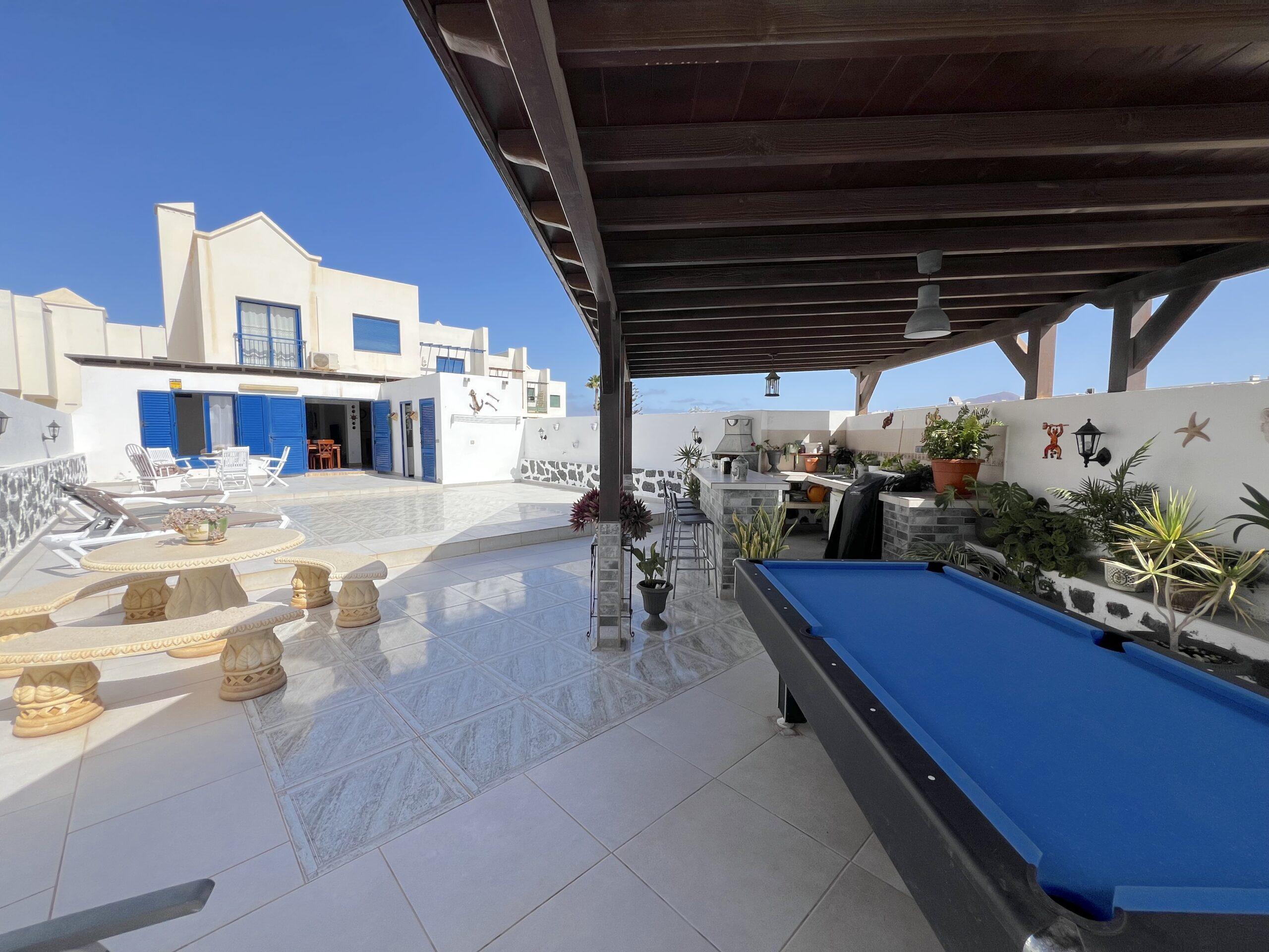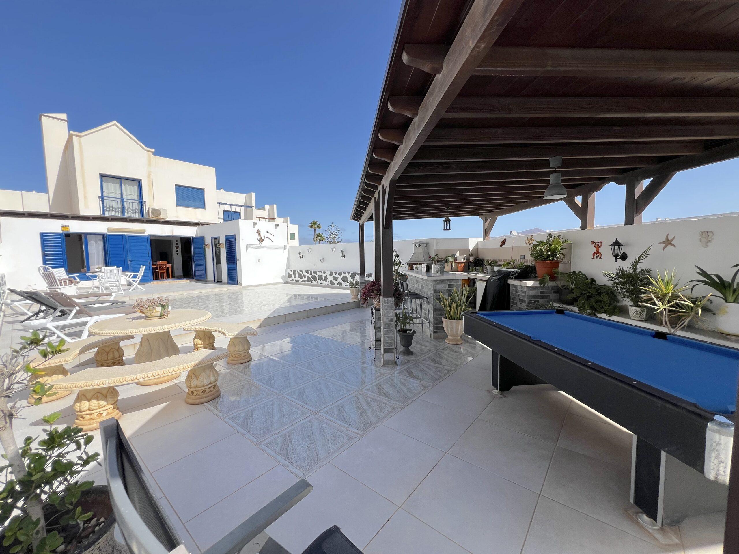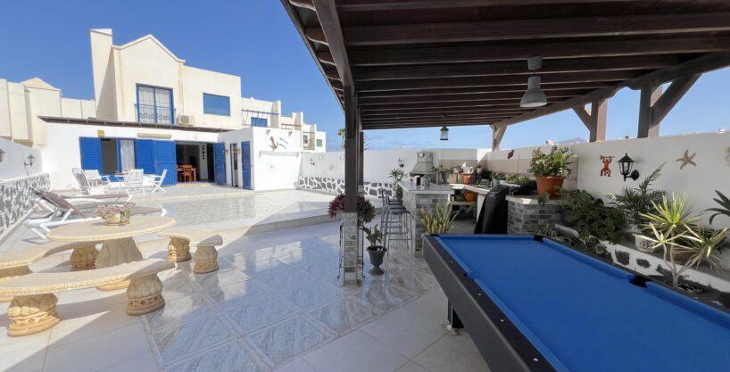 The dining area opens seamlessly onto a generous private terrace, which truly stands out as one of the villa’s finest features. Designed for entertaining and relaxation alike, it boasts a built-in bar, barbecue, and pool table, providing the perfect setting for social gatherings, alfresco dining, or simply enjoying Lanzarote’s year-round sunshine in total comfort.