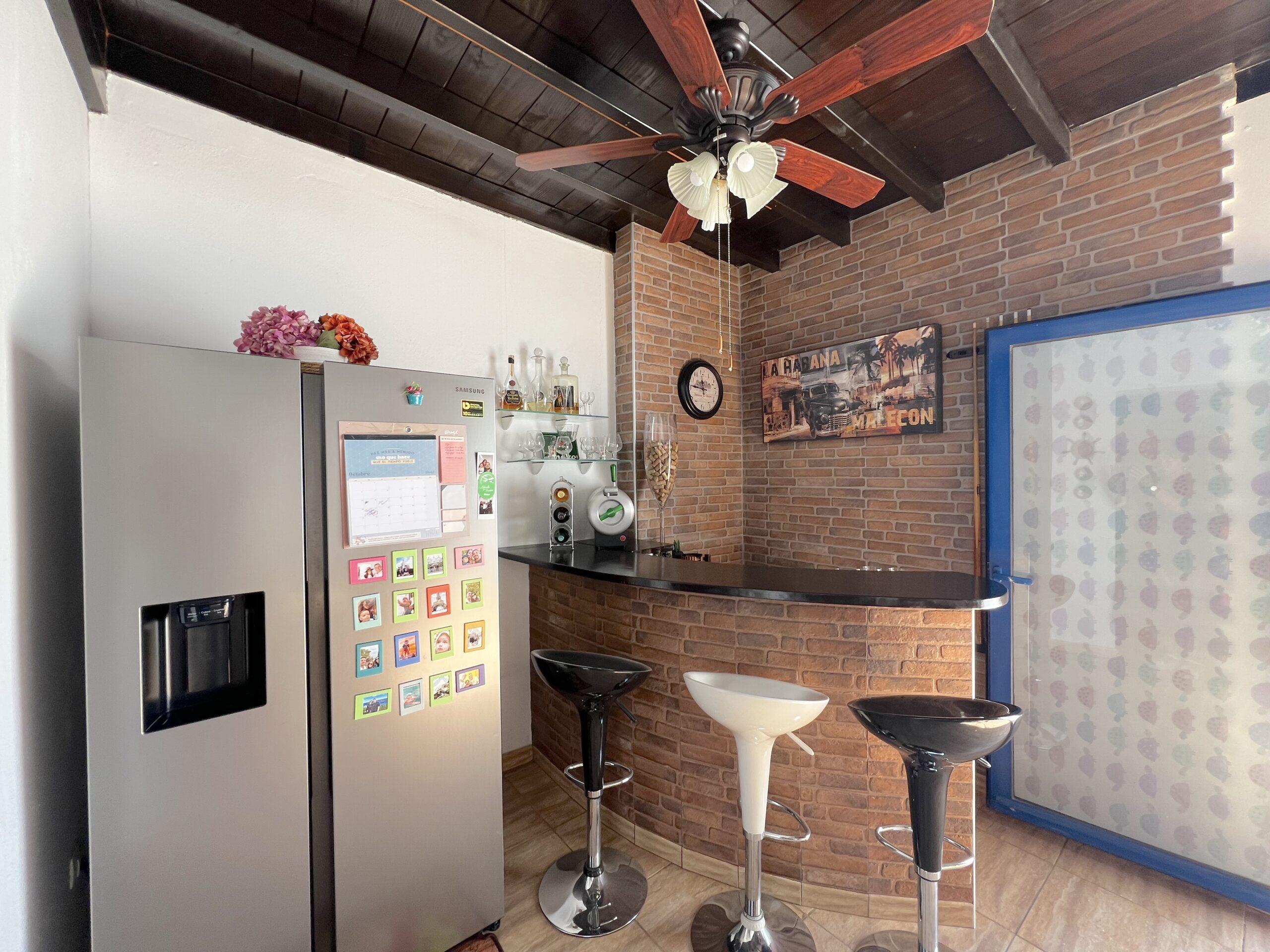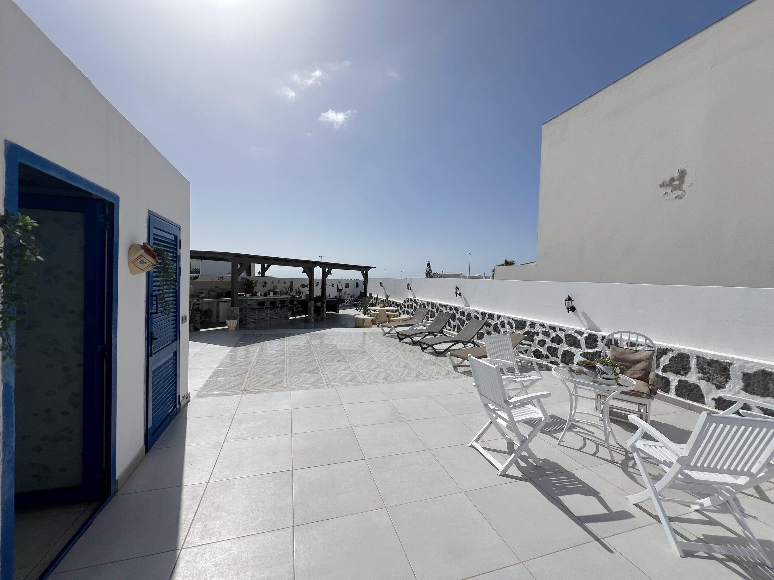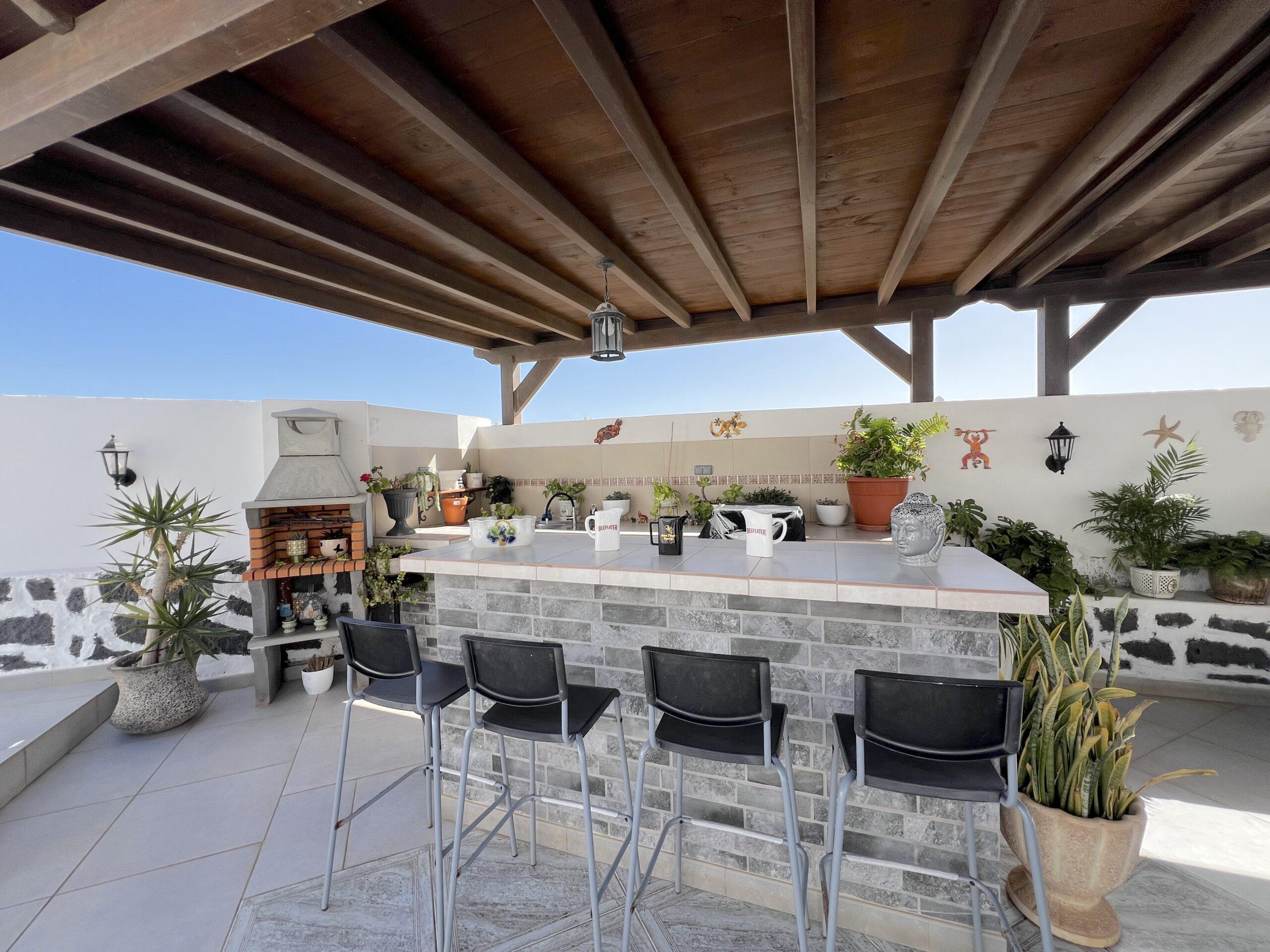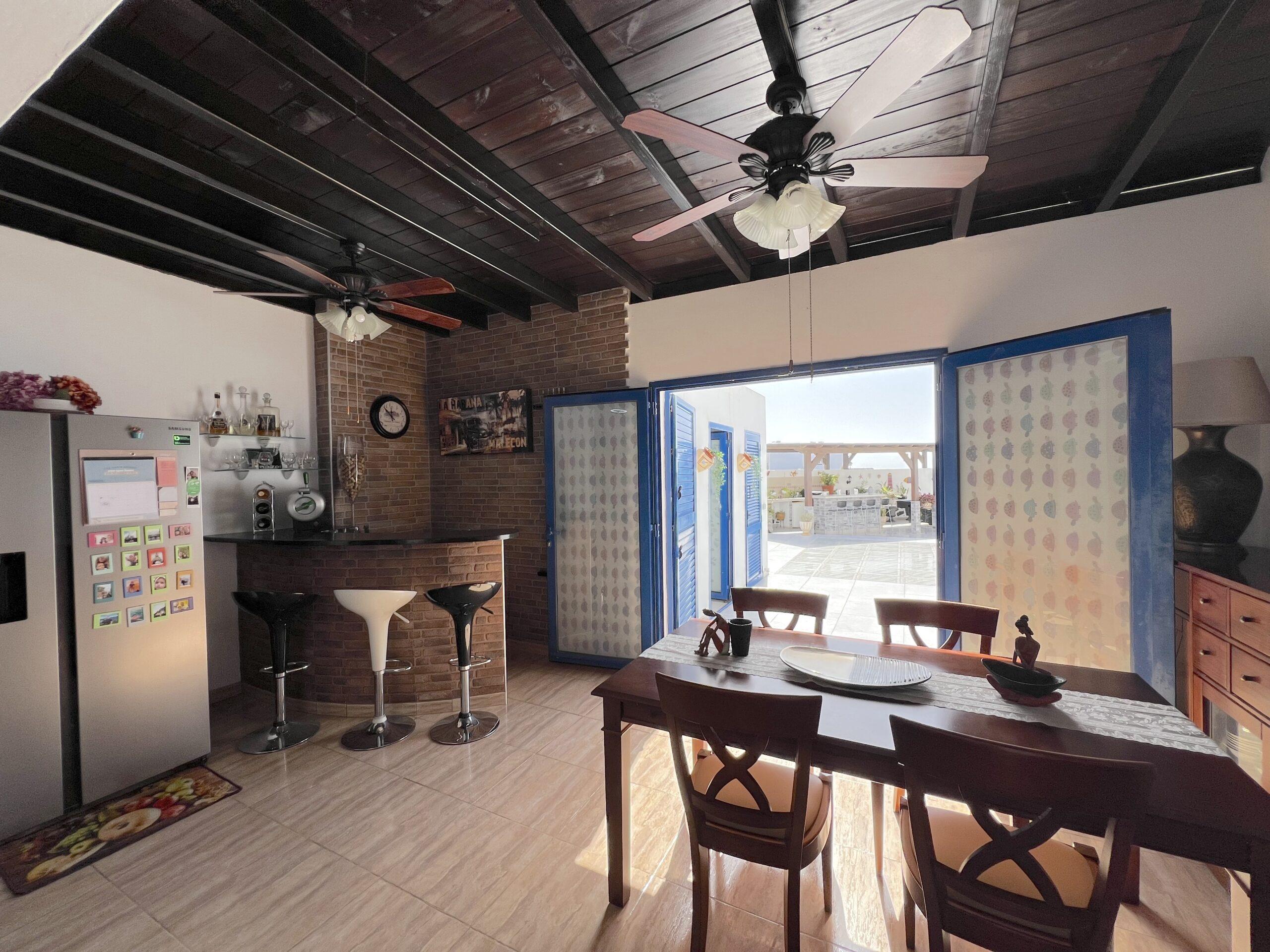 The dining area opens seamlessly onto a generous private terrace, which truly stands out as one of the villa’s finest features. Designed for entertaining and relaxation alike, it boasts a built-in bar, barbecue, and pool table, providing the perfect setting for social gatherings, alfresco dining, or simply enjoying Lanzarote’s year-round sunshine in total comfort.