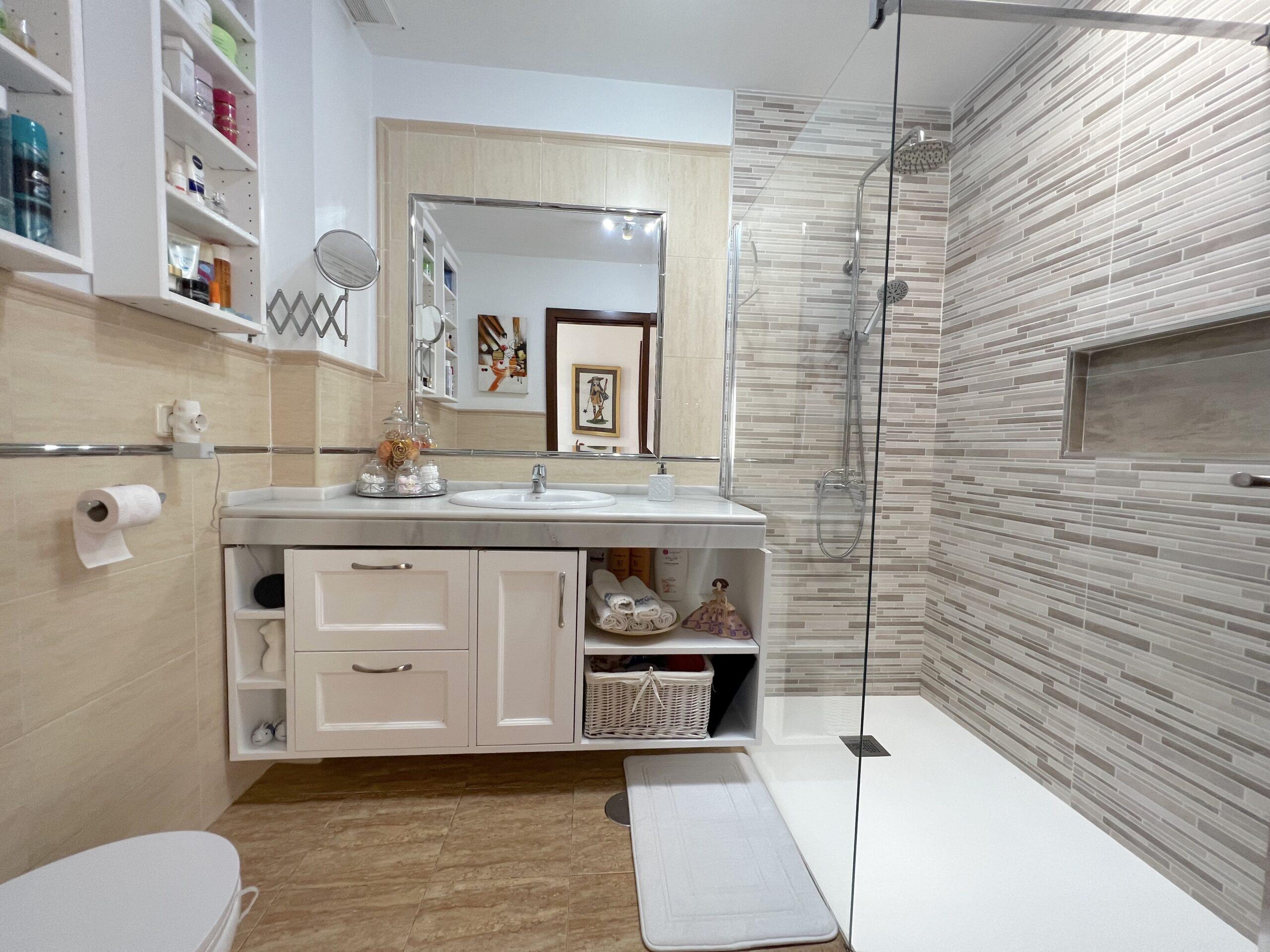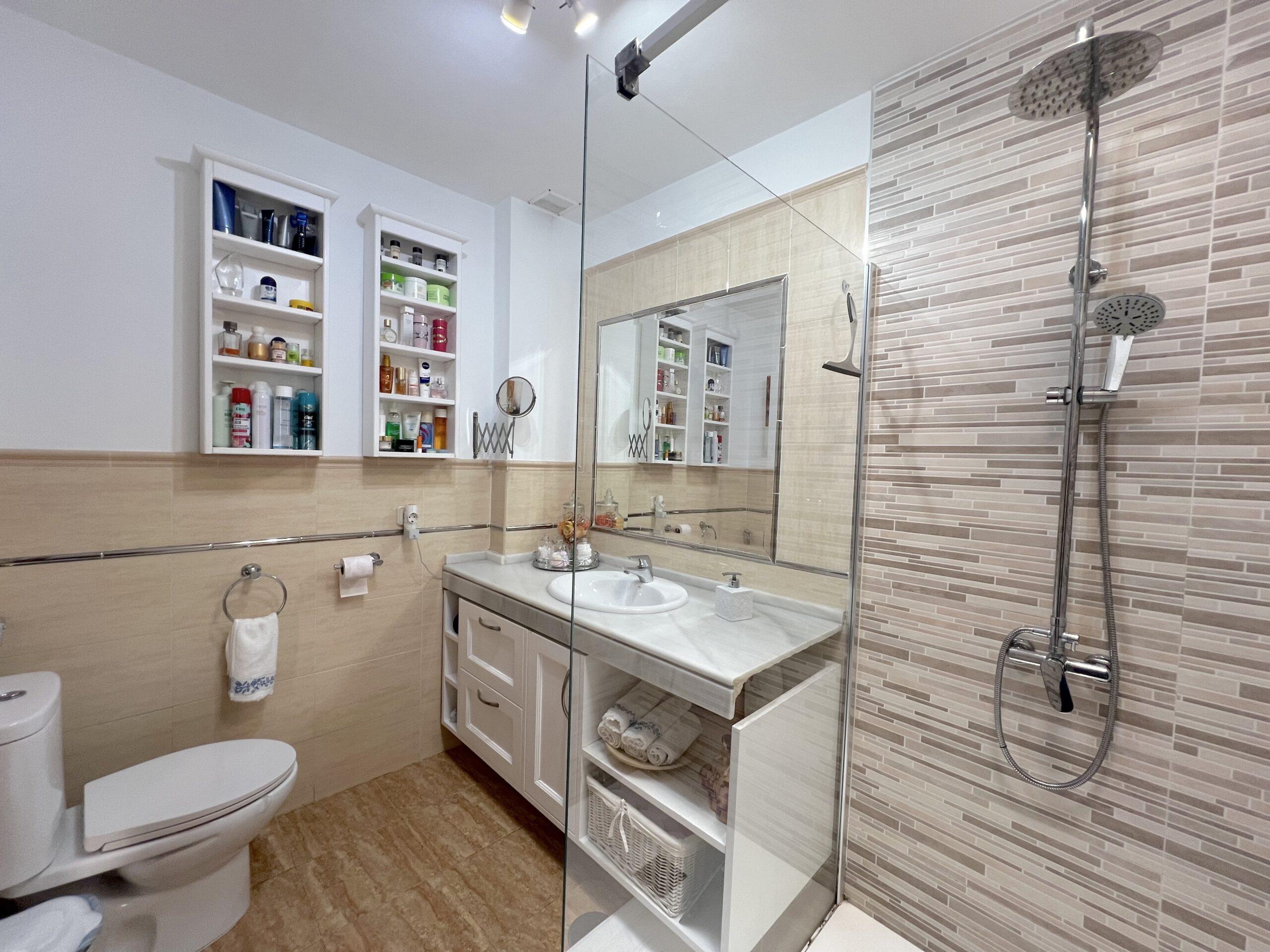 Upstairs, you will find two spacious double bedrooms. The master suite includes a walk-in wardrobe and air-conditioning, while the second bedroom also enjoys plenty of natural light. A modern family bathroom with a stylish walk-in shower completes this floor. The thoughtful layout ensures privacy and tranquillity, offering an ideal space to unwind away from the main living areas.