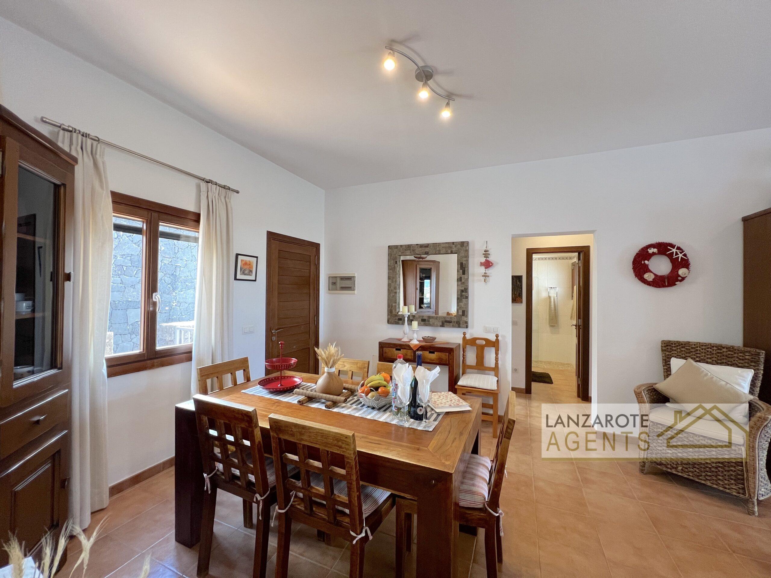 The property is thoughtfully laid out all on one level, providing a smooth and practical flow between its living spaces. Upon entering, you are welcomed by a bright and spacious living and dining area that opens through patio doors directly onto the inviting pool terrace, perfect for enjoying Lanzarote’s sunshine and outdoor living. Adjacent to this space is a fully equipped kitchen with a covered utility area, offering both convenience and functionality.